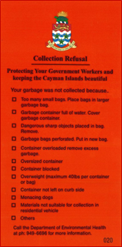 On Grand Cayman garbage collection begins at 3:00am and the Sister Islands begin at 5:00am so you may miss collection if you wait to put it out the next day.
